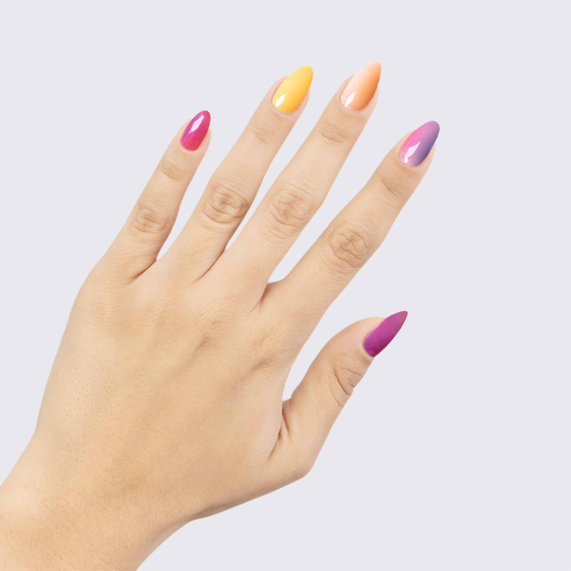 Our GLAM & GO gel nail wraps ensure that no matter how complex your chosen nail design, the application process remains incredibly simple. Our GLAM & GO gel nail wraps require no glue, base coat, or top coat—just peel them off the packaging, apply them to your nail, trim to size, cure twice, and voilà!